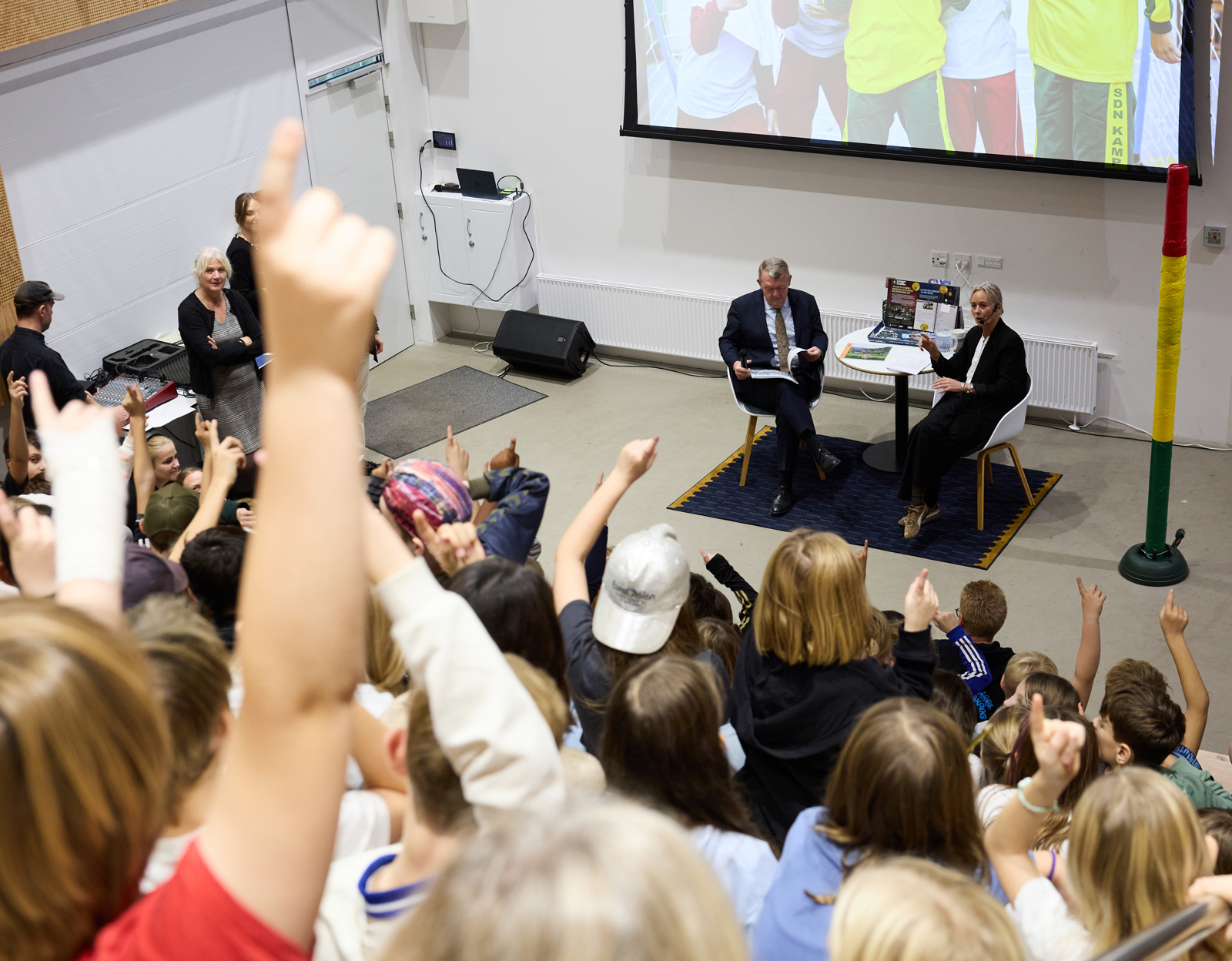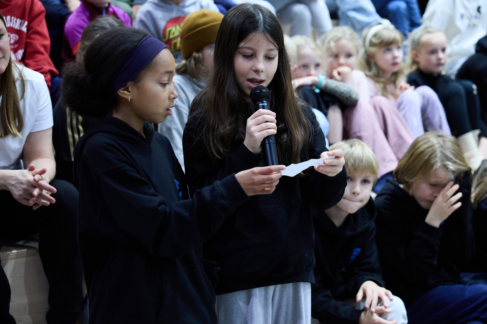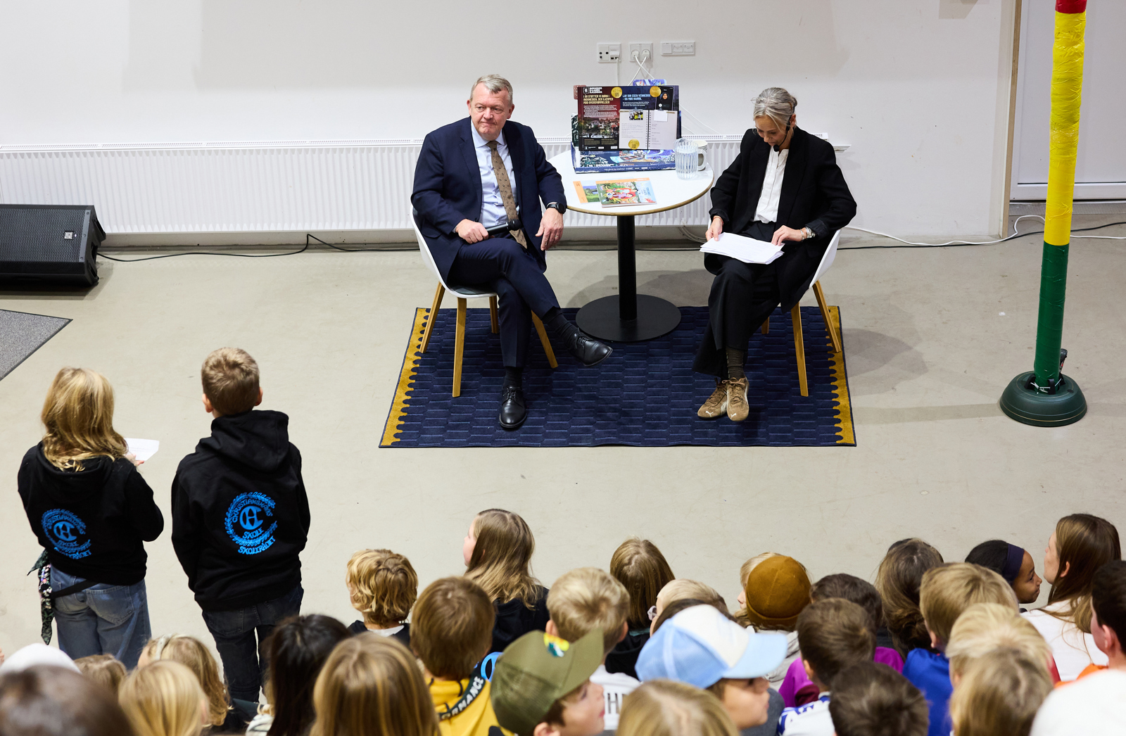 Skolerådsrepræsentanterne fra 3. og 4. årgang var virkeligt seje og modige, og stilte sig velvilligt op foran alle elever, voksne og kameraer for at tale med udenrigsministeren på vegne af skolen. Et stort tak til dem, til 4. årgang for at vinde lodtrækningen, og til alle voksne og elever fra årgangene, som var med til at gøre det til en speciel oplevelse.